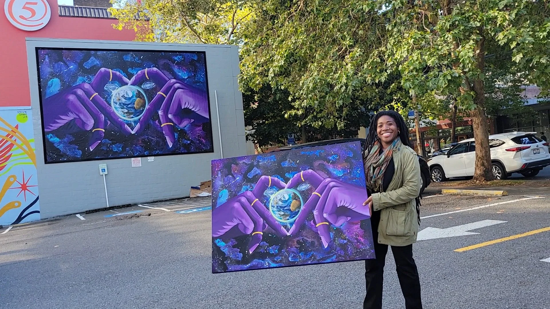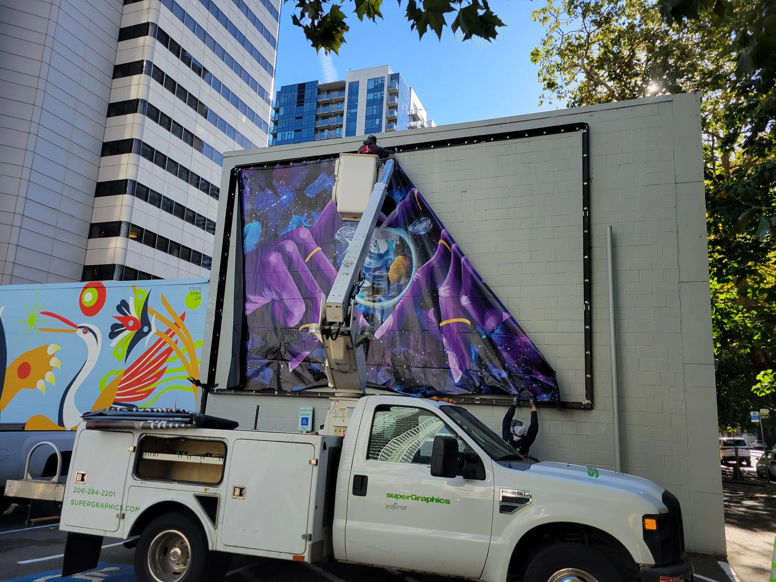Cosmic Heartbeat Vinyl billboard in Belltown, Seattle, WA See how it was made on the YouTube channel”: