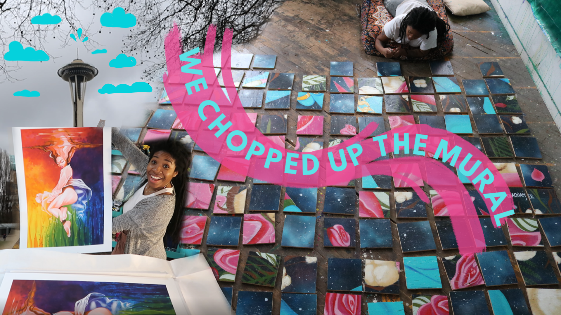 Okay, so let's dive into this: new polls. Oh, my God, Is everybody okay? Okay. Okay, I titled this, "Why do I destroy my original art?" Now, of course, that is being a bit dramatic, because I don't consider myself destroying my work, but I did cut up a painting that I had recently created for the Paramount Theater. Now I painted this back in the day. I painted this in 2020. That's not too far back in time. But y'all know what? This panini press, like, time is so warped; it feels like so long ago, even though it was still so recent. So this is something that I was inspired to do, because I actually have done it before. And if you are for-real For-Real OG, then you might remember the large scale purple Goddess that I painted in front of the KEXP radio station, which is located in Seattle Center. Below, you'll see some pictures that I included, that was a part of that process, way in the past.